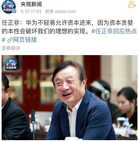 任正非5月21日在接受央视采访时表示,“华为不轻易允许资本进来,因为资本贪婪的本性会破坏我们的理想的实现。”