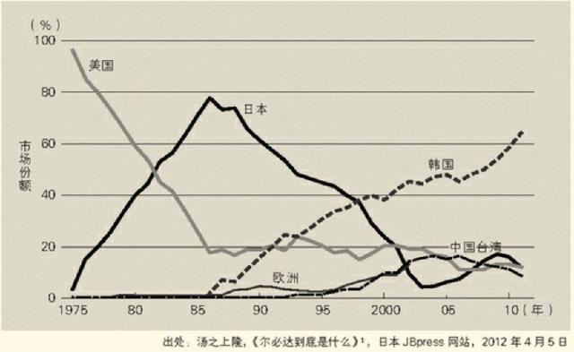 日本半导体芯片产业从1986年最高40%,一路跌跌不休跌到2011年的15%,吐出超过一半的市场份额,其中的DRAM受打击最大,从最高点近80%的全球市场份额,一路跌到最低10%(2010年),回吐近70%。