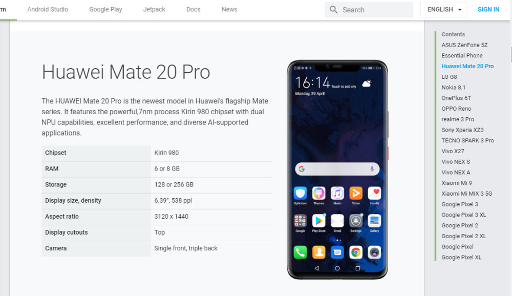 新京报快讯(记者 陆一夫)华为重返安卓系统?5月31日,在Android Q Beta 测试设备页面上,华为Mate 20 Pro重新出现,不过值得注意的是,目前该设备只出现在英文页面上,中文页面并未显示。目前华为、安卓方面未对此作出回应。