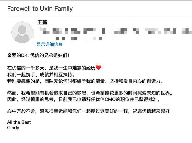 据一封曝光的内部邮件显示,王鑫称:“非常感谢戴琨和优信兄弟姐妹们三年来对我的信任与支持。优信把行业引领到了一个全新的高度,创造了那么多的第一,是我职业生涯中的骄傲。”