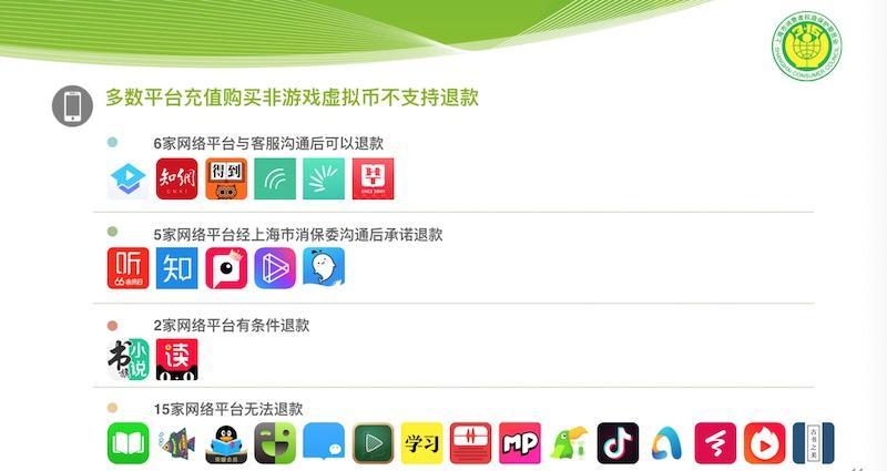 28家以购买非游戏类虚拟币形式充值的网络平台中,有6家网络平台与客服沟通后可以退款,分别是腾迅课堂、手机知网、得到、扇贝听力、扇贝单词、华图在线;有5家经上海市消保委沟通后承诺退款,如喜马拉雅、知乎、天天P图、微视、鲸鱼阅读;有2家有条件退款,分别是书旗小说、天猫读书。