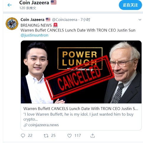 币圈媒体Coinjazeera报道称巴菲特取消与孙宇晨的午宴