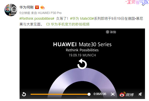 9月1日消息,华为终端总裁何刚今天在微博宣布,Mate 30系列将在9月19日于德国慕尼黑发布。