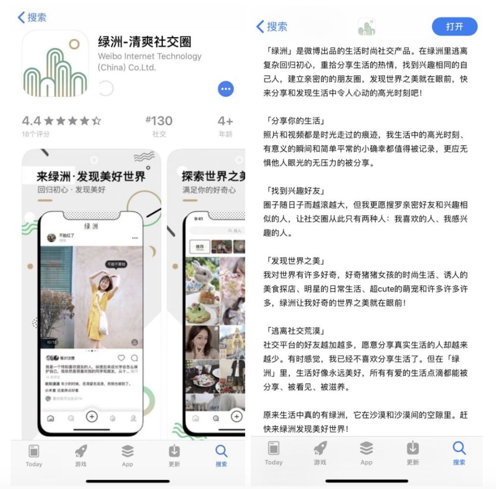 “来绿洲,发现美好世界。”继搜狐推出“狐友”后,微博也推出了新社交产品“绿洲”。