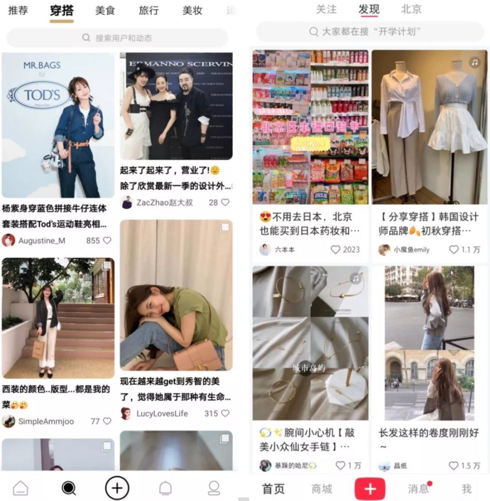 更值得注意的是,绿洲底部菜单栏发现页入口,是内容的集中展示区。目前设有“穿搭”、“美食”、“旅行”、“美妆”、“明星”等兴趣栏,在相应兴趣栏对内容进行集中的推荐。兴趣圈子氛围更为浓厚。