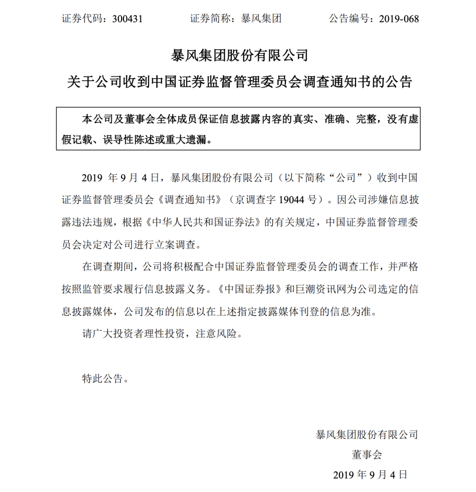 9月4日晚,暴风集团发布公告称,因公司涉嫌信息披露违法违规,证监会已决定对暴风集团进行立案调查。