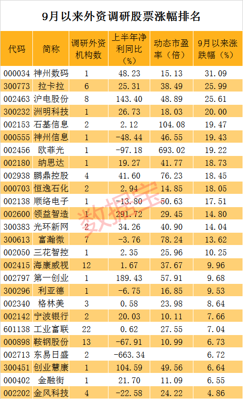 低估值的股票也是外资机构调研的重点对象。从榜单中来看,市盈率最低的是宁波银行,最新动态市盈率为10.11倍,该股上半年净利增速超过20%。鞍钢股份市盈率倒数第二,为10.99倍,不过该股上半年净利大幅下降,降幅接近68%。金融街市盈率也只有11倍左右,该股上半年净利增速达到21.7%。此外,恒逸石化、神州数码、利亚德、周大生、洲明科技等个股动态市盈率均不足20倍。