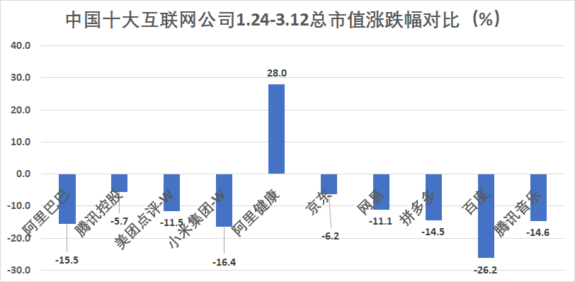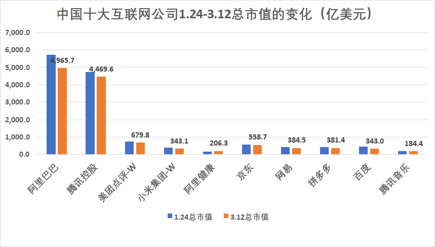 《深网》以3月12日为节点,列出总市值前十的中国互联网公司(为方便比较,港股上市的公司总市值统一以美元计算),其中,阿里巴巴和腾讯分别以4965.7亿美元市值、4469.6亿美元市值排名前二,其后分别为美团、京东、网易、拼多多、小米、百度、阿里健康、腾讯音乐。百度、阿里巴巴和小米整体跌幅均超过15%。