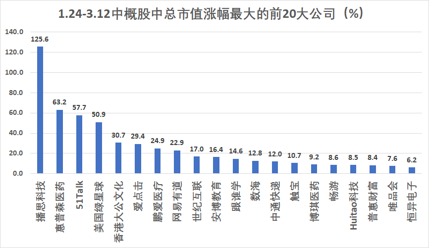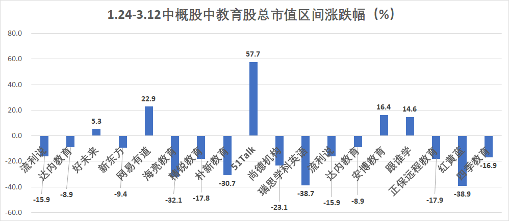 在涨幅最大的20家中概股公司中,播思科技在疫情期间总市值涨幅最大,区间涨幅为125.6%,公司总市值从1月24日的0.6亿美元,涨到3月12日的1.3亿美元。在涨幅最大的20家公司中,教育公司占了4家,其中51talk、网易有道、跟谁学为在线教育公司。受“停课不停学”政策的影响,线教育股业绩持续爆发。安博教育业务涉及基础教育、职业教育和企业培训。