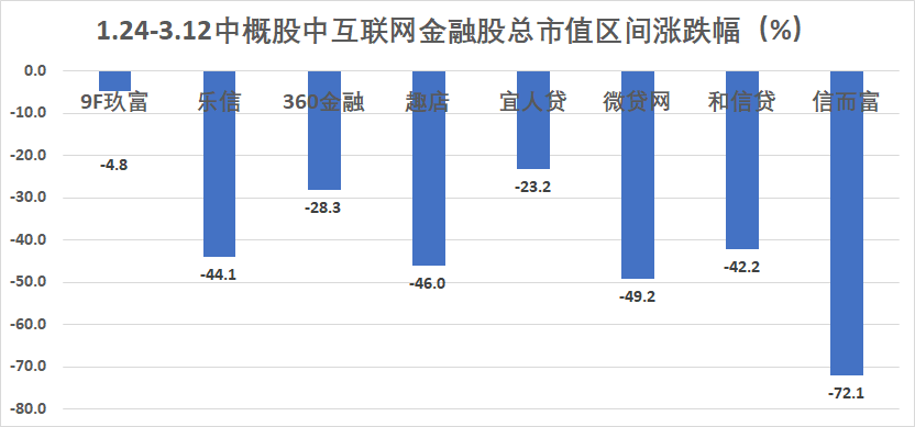 在互联网金融领域,除玖富外,疫情期间,在美上市的多家互联网金融公司区间跌幅都在20%以上。其中,信而富区间降幅72.1%,从1月24日的0.14亿美元,降低到3月12日的0.04亿美元。