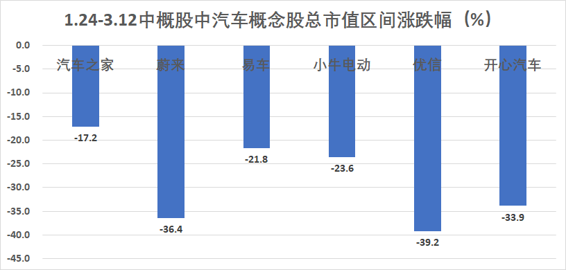 在汽车互联网领域,优信二手车区间降幅39.2%,公司总市值从1月24日的7.2亿美元,降到3月12日的4.7亿美元;蔚来区间降幅36.4%,从1月24日49.1亿美元的市值,降到3月12日的32.9亿美元。