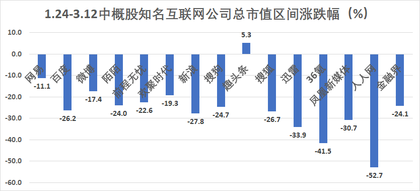 其他14家公司疫情期间总市值均处于下跌状态。其中人人网的市值从1月24日的0.4亿美元跌至3月12日的0.2亿美元,区间跌幅52.7%。
