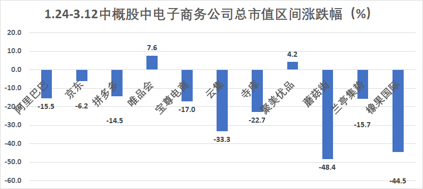 在《深网》统计的11家电商公司中,唯品会和聚美优品总市值区间上涨。其中唯品会总市值从1月24日的90.8亿美元,上涨至3月12日的100.4亿美元;聚美优品的市值从1月24日2.1亿美元,上涨至3月12日的2.3亿美元。