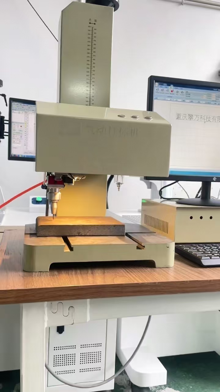 气动打标机的原理是首先要把中英文字符、图形的内容输入计算机,计算机再将它转变为数字信号传送给控制器,然后在压缩空气的作用下,打标针做高频微冲击运动撞击产品的表面,产品的表面从而留下了凹形痕迹。
