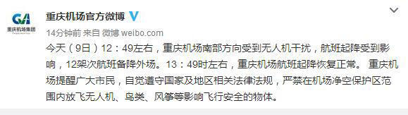 另据华龙网报道:官方发布:重庆机场遇无人机扰航 致12架次航班备降