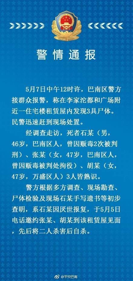 5月7日中午12点过,巴南区李家沱都和广场4幢12楼一住户家中,发现了三具尸体。
